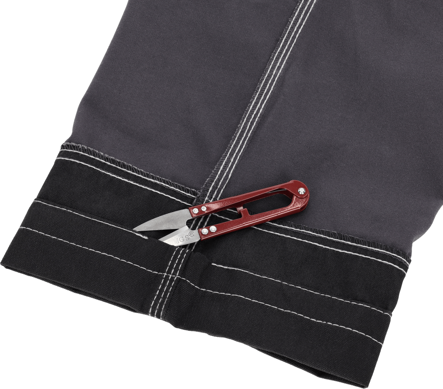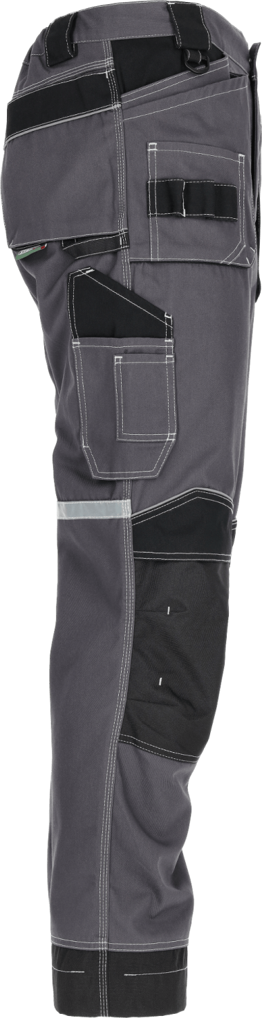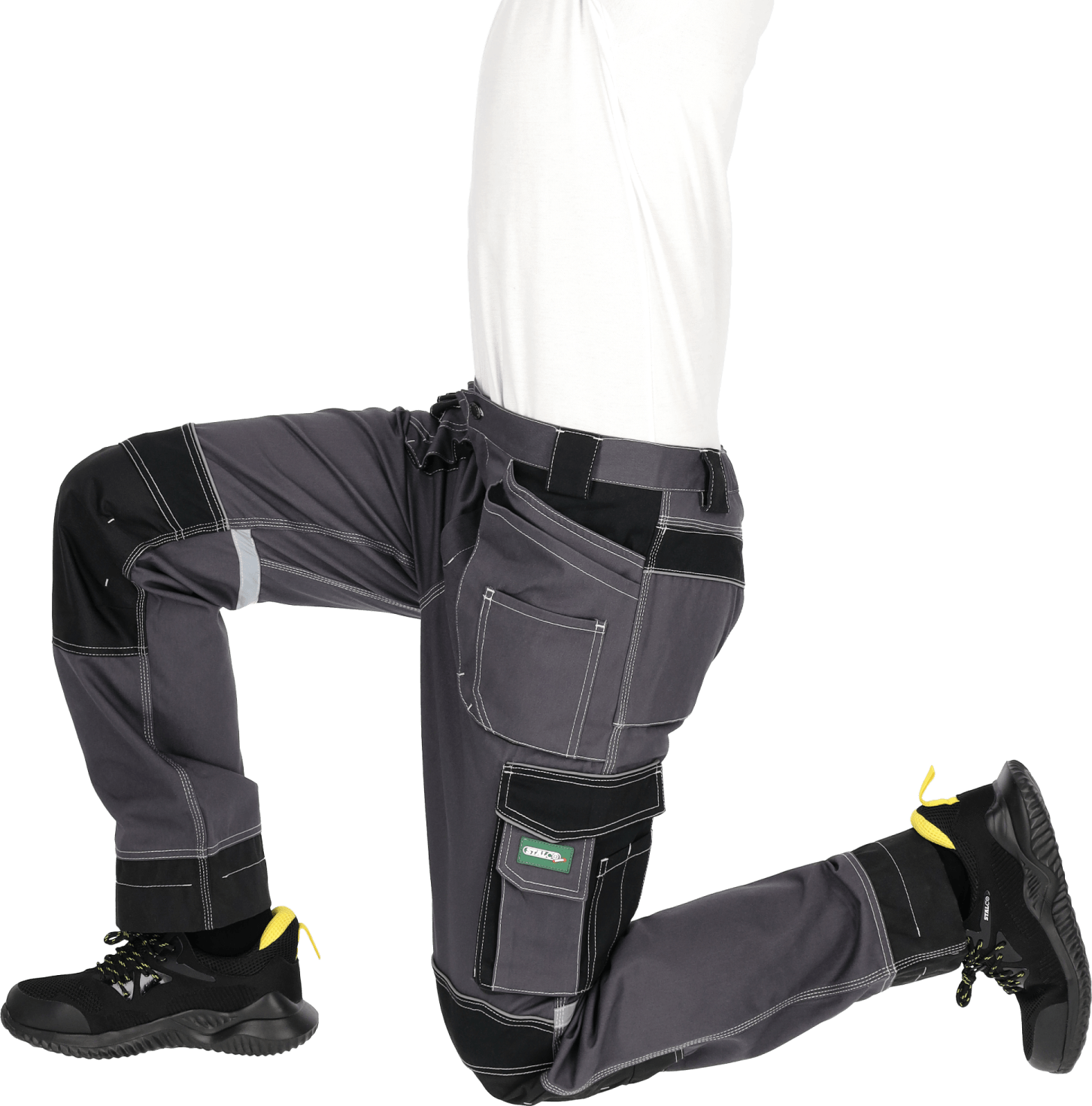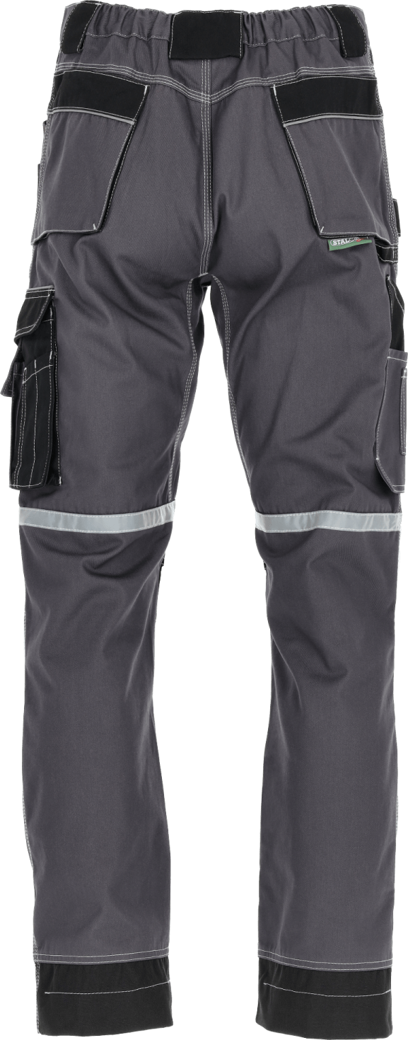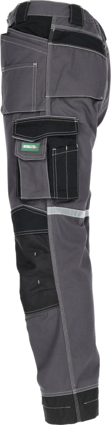 Potrójne szwy i wzmocnienia rzepów Podczas pracy w wymuszonych pozycjach, spodnie nie rozrywają się dzięki potrójnym szwom. Ponadto zostały wyposażone w szeroki klin w kroku i wzmacniające rygle. Dodatkowe wzmocnienia w postaci przeszycia w kształcie litery X znajdują się na wszystkich rzepach. Zapewnia to dłuższą żywotność odzieży.