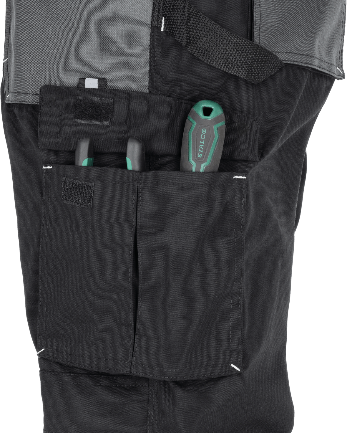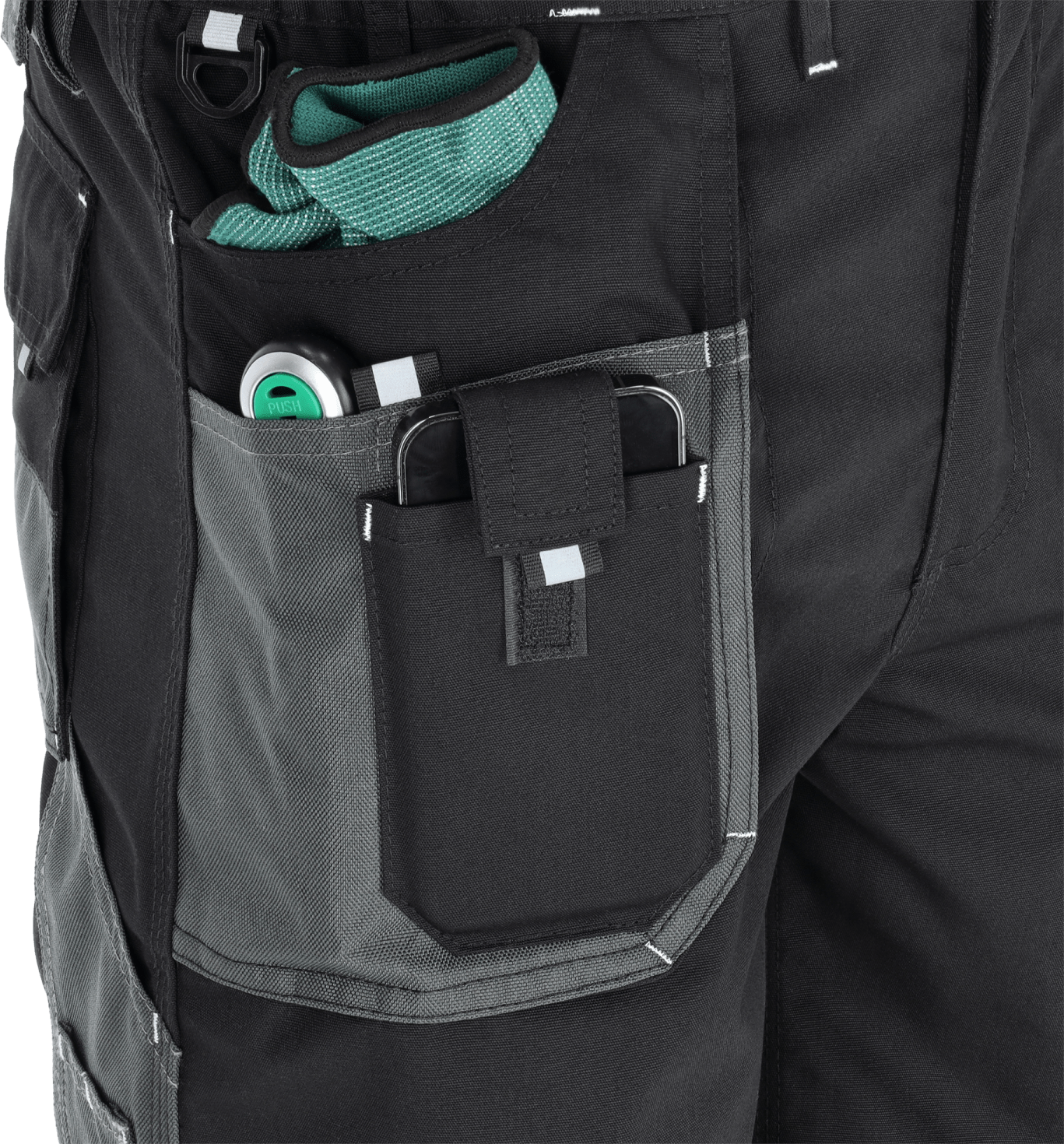 Wielofunkcyjne i wygodne kieszenie Spodnie mają kilka funkcjonalnych kieszeni na osobiste przedmioty i podręczne akcesoria. Prócz kieszeni wzmocnionych materiałem OXFORD, Cztery z nich znajdują się w obrębie pasa z przodu i z tyłu. Dodatkowe dwie mają uchwyt na młotek, kieszeń na miarkę i kieszonkę na telefon.