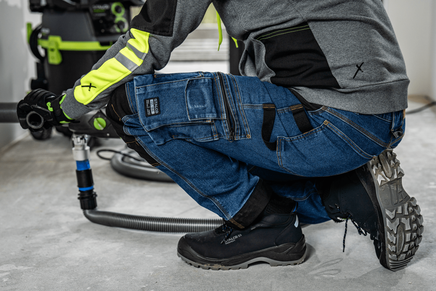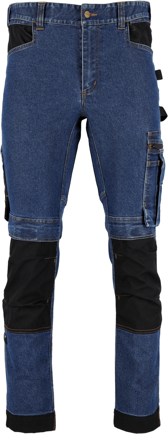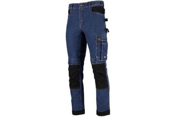 Spodnie robocze jeansowe JEAN z linii STALCO PERFECT to funkcjonalna odzież do pracy. Spodnie mają uniwersalny krój i ponadczasowe akcenty tj. granatowy twill, nity i guzik w kolorze postarzanego złota, imitacja skórki na tyle w pasie. Zostały wykonane z porządnej tkaniny bawełnianej z dodatkiem wzmocnienia poliestrowego i elastanu. Dzięki temu materiał jest przyjemny dla skóry, elastyczny a jednocześnie bardzo wytrzymały. Spodnie zostały wyposażone w dodatkowe wzmocnienia i elementy poprawiające ich wytrzymałość. Dodatkowo znalazły się na nich elementy kontrastowe, poprawiające widoczność pracownika. Mogą być stosowane do różnego rodzaju prac prowadzonych w branżach takich jak rolniczo­-spożywcza, instalacyjna, stolarska a nawet dekarska.
