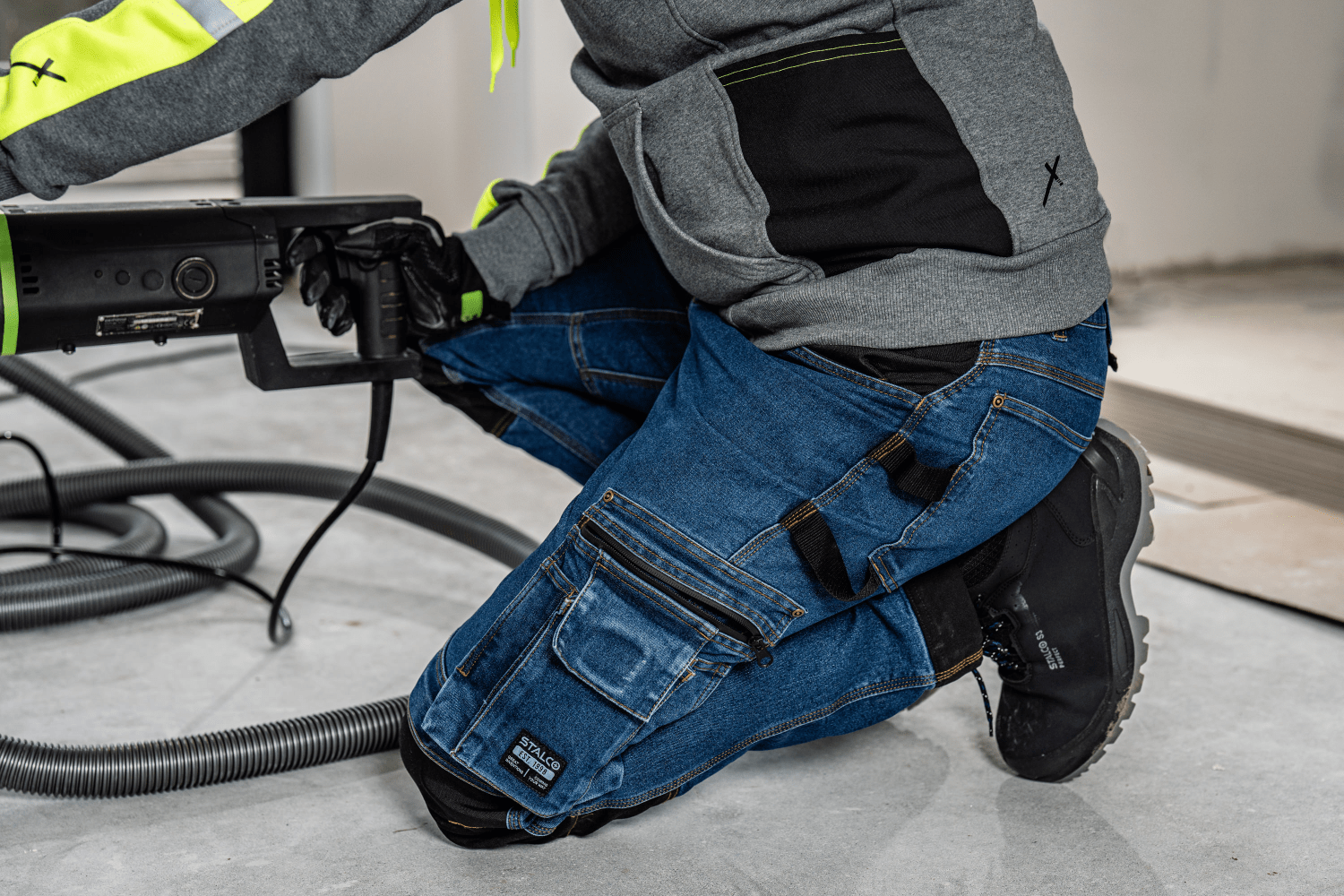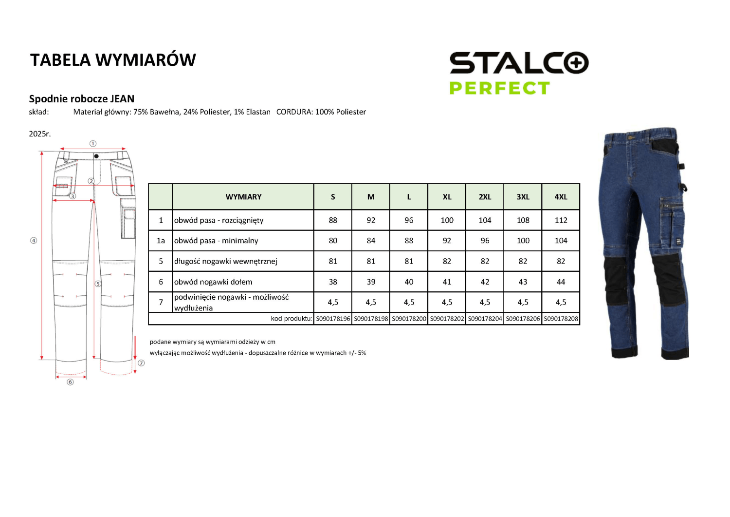 Wzmocnienia z tkaniny CORDURA Spodnie JEAN marki STALCO PERFECT zostały wyposażone we wzmocnienia z tkaniny poliestrowej CORDURA. Materiał znalazł się na kieszeniach w okolicach kolan, przeznaczonych na wkładki piankowe, chroniące kolana. Ponadto wstawki z tkaniny CORDURA znalazły się w dolnej części nogawek – wzmacniają strefę najbardziej narażoną na rozdarcia i uszkodzenia, nie nasiąkają wodą oraz dają możliwość wydłużenia nogawek o 4 cm.