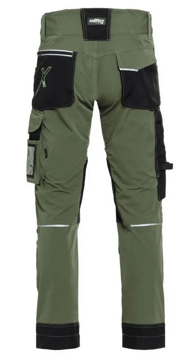 Model wykonano z elastycznej tkaniny o charakterystyce softshellu, która dopasowuje się do sylwetki i zapewnia swobodę ruchu podczas pracy. Spodnie wyposażono w aktywny pas z podwyższonym stanem z tyłu, stabilizujący odzież podczas schylania i pracy w pozycji klęczącej. Otwory wentylacyjne zapinane na zamek umożliwiają regulację cyrkulacji powietrza i odprowadzanie nadmiaru ciepła.