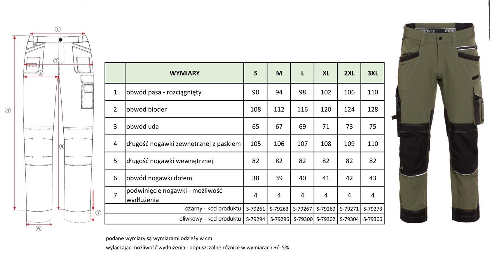 - nogawki z możliwością wydłużenia o 4 cm